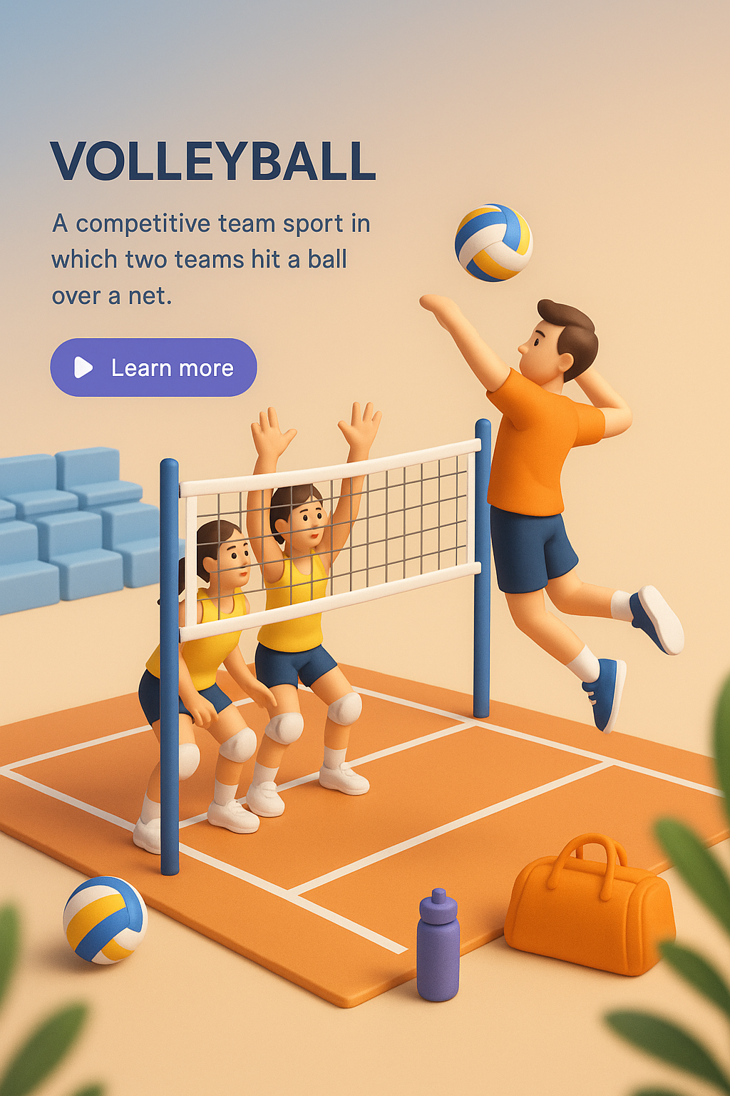 A vibrant 3D illustration depicting a volleyball game, featuring players in action, a net, and equipment. The scene is designed with a smooth gradient background and engaging elements.