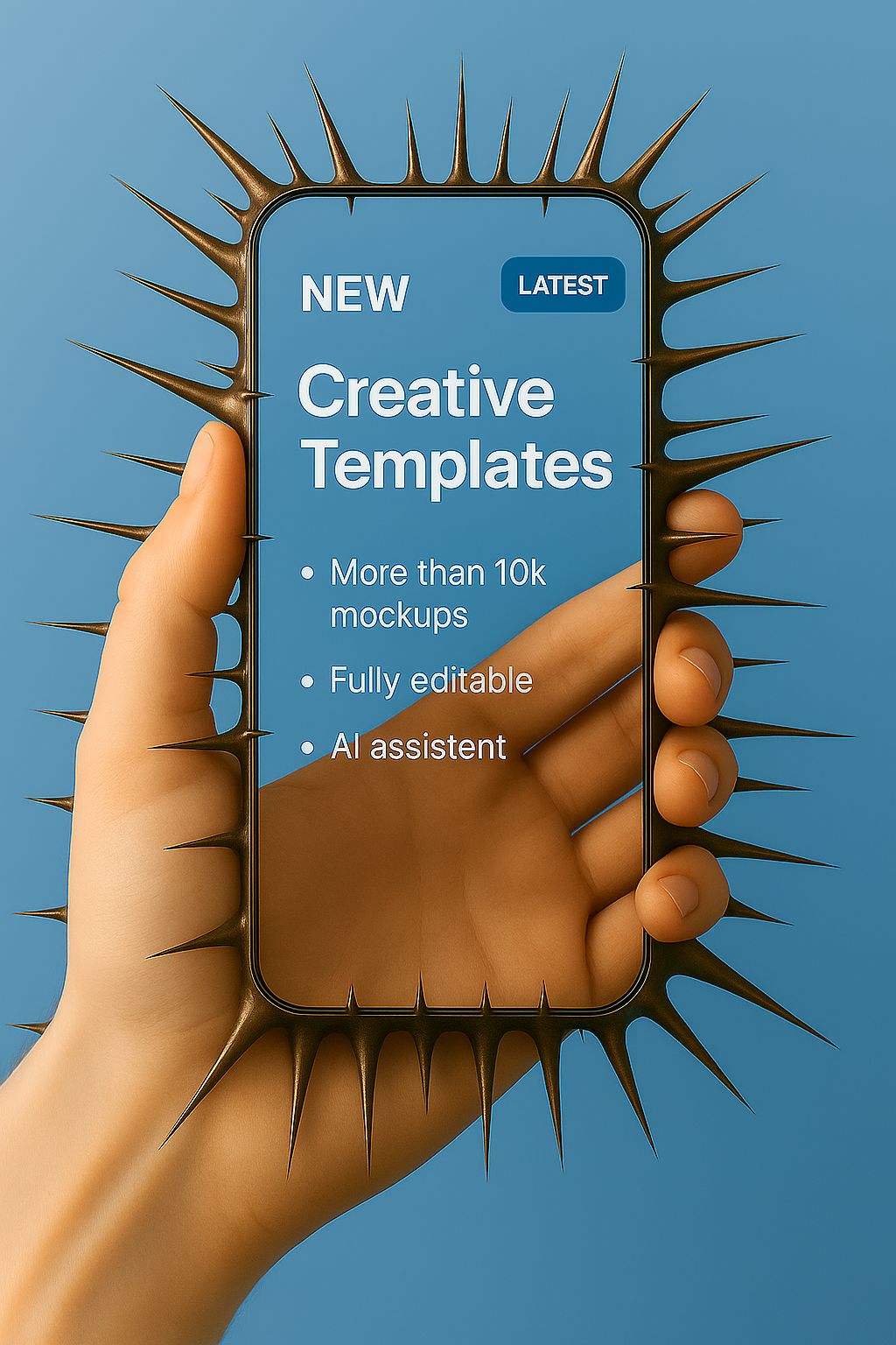/Collection: /by davooda/Type: PNG/Stylish promotional mockup showcasing a phone with creative templates. The design features a hand holding the device, surrounded by spiky elements, ideal for modern marketing and design showcases.