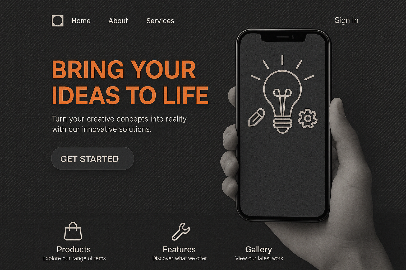 A modern landing page layout featuring a smartphone displaying a light bulb design. Includes bold typography and clear call-to-action buttons. A well-structured, dynamic composition.