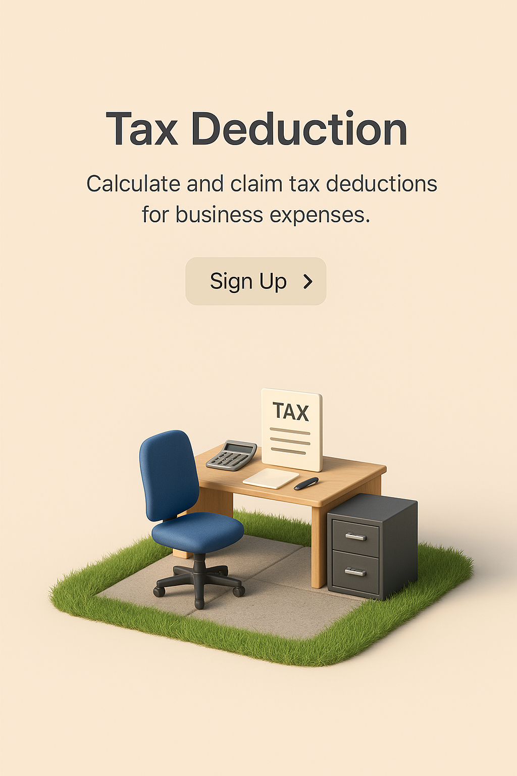 /Collection: /by davooda/Type: PNG/A visually appealing 3D scene depicting a small office setup featuring a desk, chair, and filing cabinet. The background is a smooth gradient, enhancing the focus on tax deduction messaging.