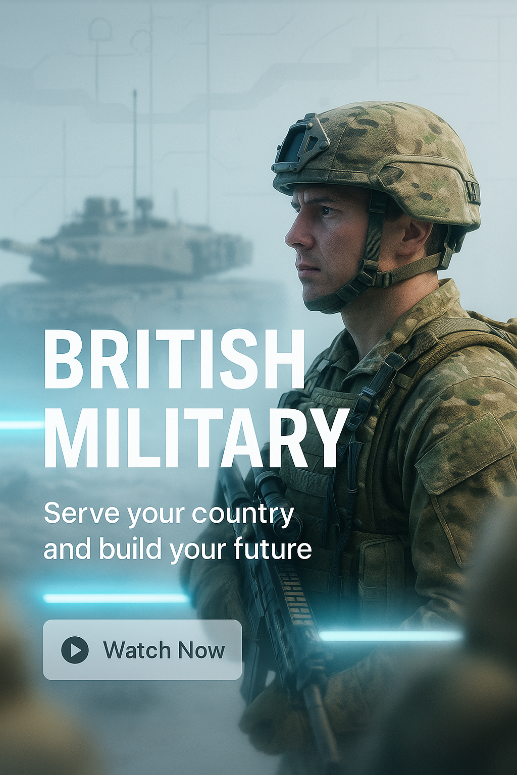 /Collection: /by davooda/Type: PNG/Engaging recruitment advertisement showcasing a British soldier, designed to attract potential recruits with a modern and professional visual style, emphasizing service and future opportunities.