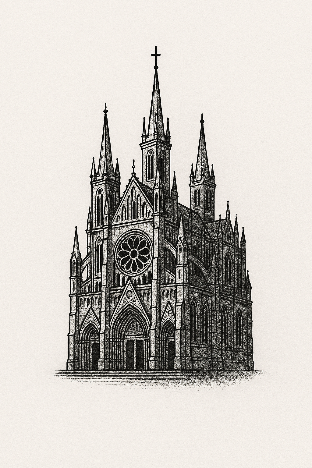 /Collection: /by davooda/Type: PNG/This image features a detailed black and white illustration of a Gothic-style church, showcasing intricate architectural elements. Ideal for art prints or architectural studies.