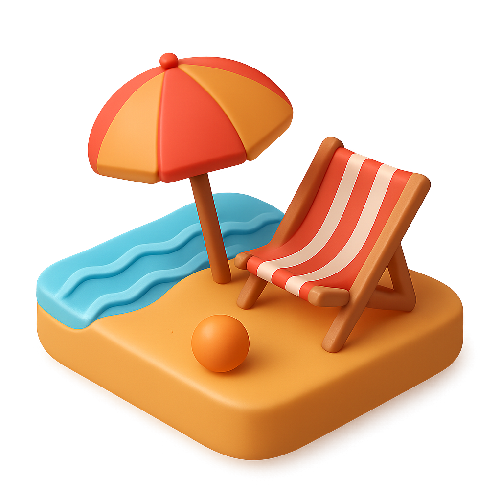A vibrant 3D beach scene featuring a striped lounge chair, a colorful beach umbrella, a round ball, and a wavy pool. The design has a playful isometric style.