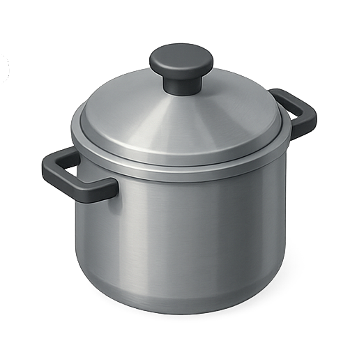 Realistic graphic of a stainless steel cooking pot with a lid and handles, ideal for kitchenware displays or product catalogs. This image showcases a clean and modern design.
