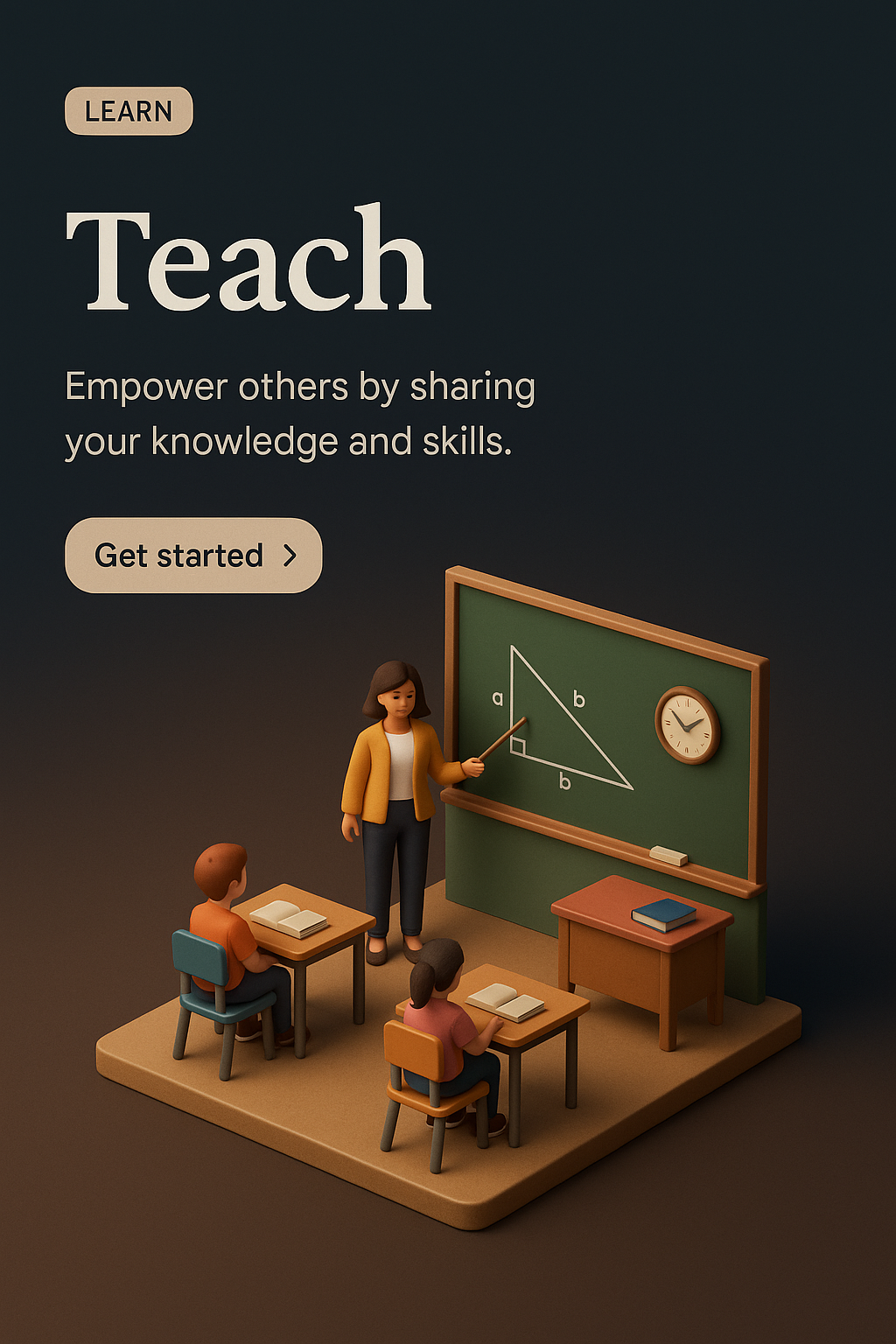 A realistic 3D scene depicting a classroom environment where a teacher is instructing students. The background features a dark gradient, enhancing the focus on the teaching elements.