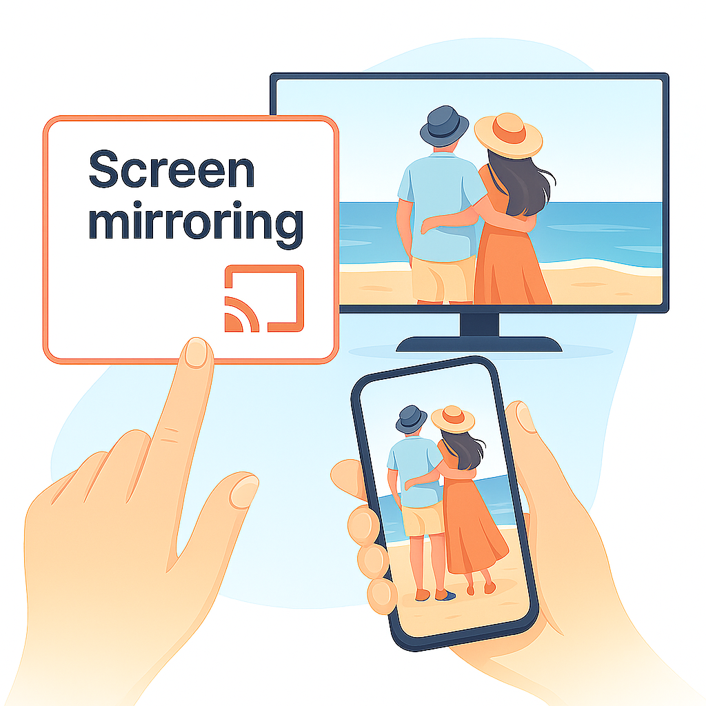 /Collection: /by davooda/Type: PNG/A modern illustration depicting the concept of screen mirroring, showcasing a smartphone and a TV displaying the same image of a couple at the beach. Ideal for tech-related content.