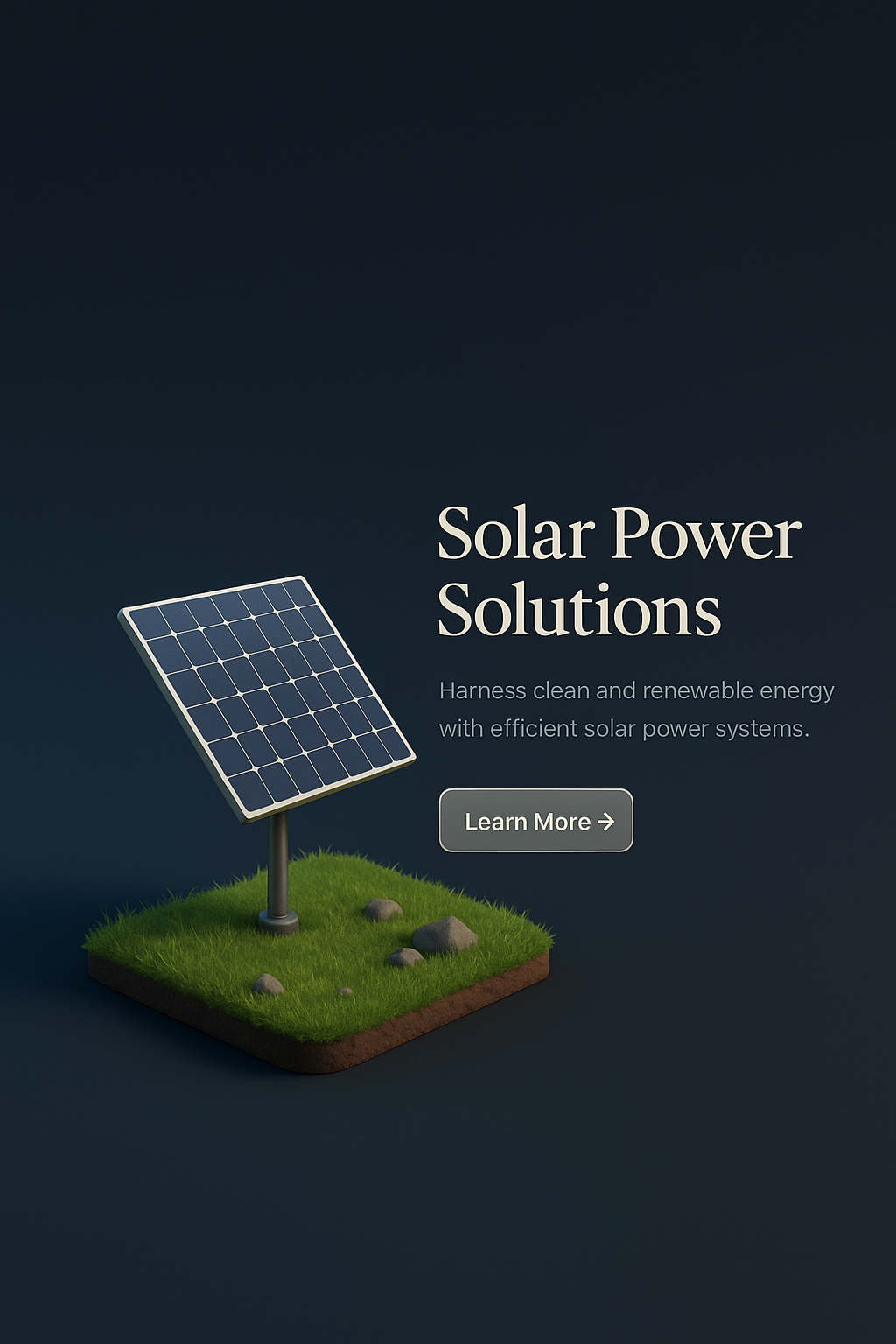 /Collection: /by davooda/Type: PNG/A zoomed-out 3D depiction of a solar panel on grassy terrain, surrounded by rocks. The dark gradient background enhances the visual elements, featuring clean typography and a clear call-to-action.