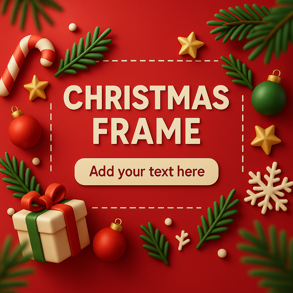 A vibrant Christmas-themed frame graphic featuring holiday decorations. Ideal for social media posts or festive invitations, inviting users to add their own text.