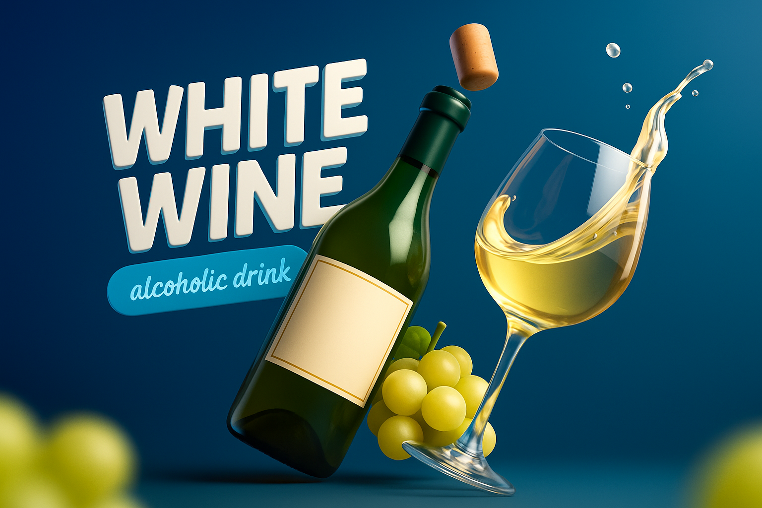 A vibrant 3D illustration showcasing a bottle of white wine and a glass. Grapes are artistically arranged, with splashes of wine adding dynamism to the scene.