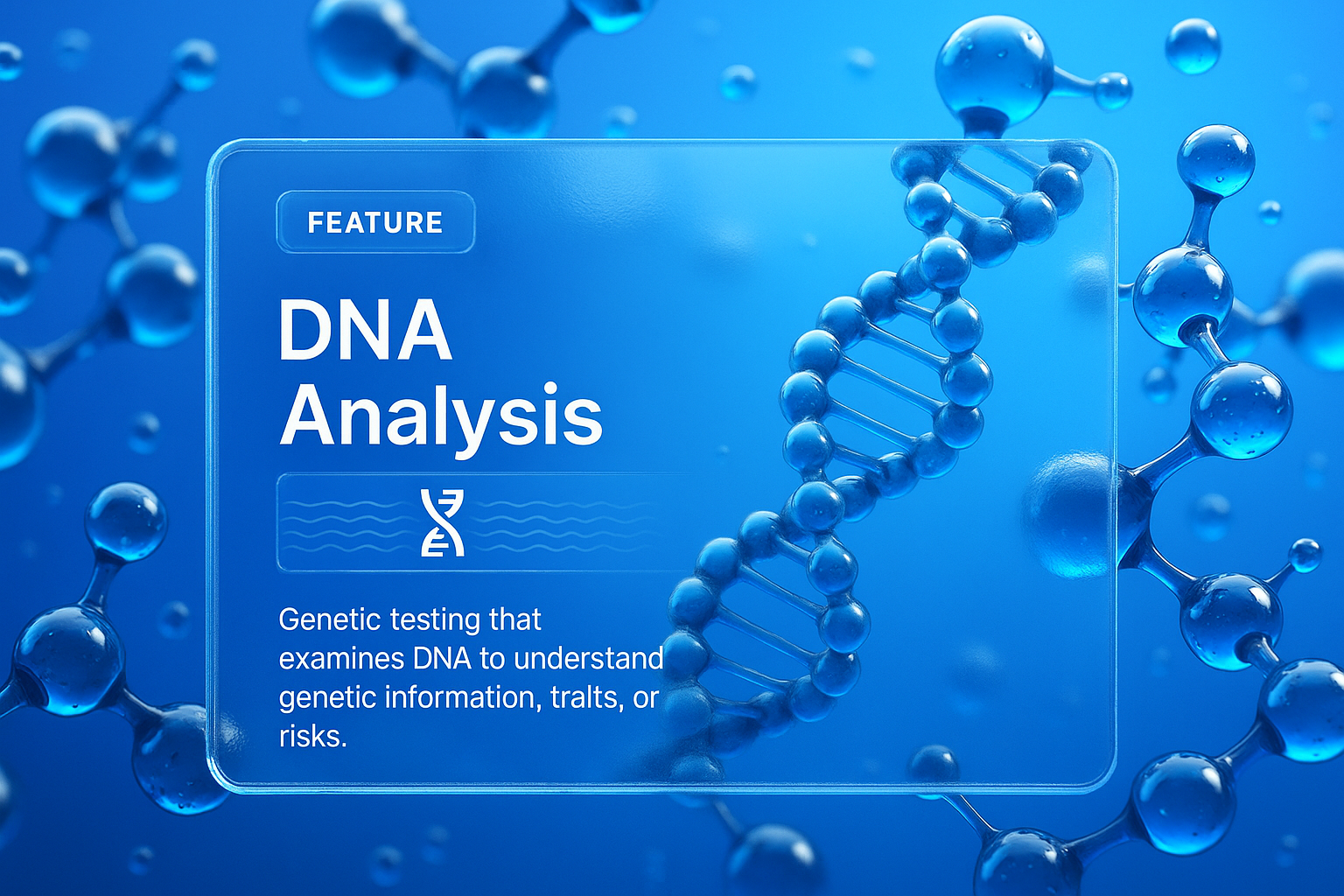 A visually striking representation of DNA analysis, showcasing blue molecular structures against a gradient background. The design includes a transparent panel detailing genetic testing.