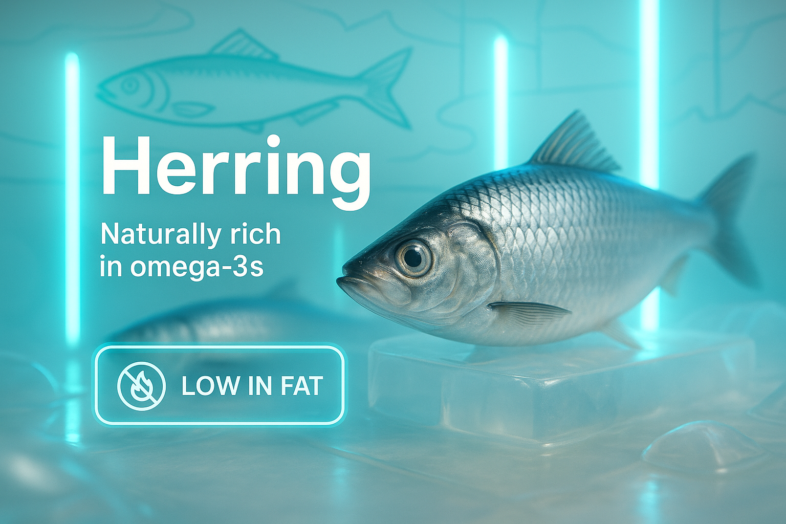 /Collection: /by davooda/Type: PNG/A visually appealing 3D product display featuring a herring fish with highlights on its nutritional benefits, designed for promotional or educational purposes in health and nutrition.