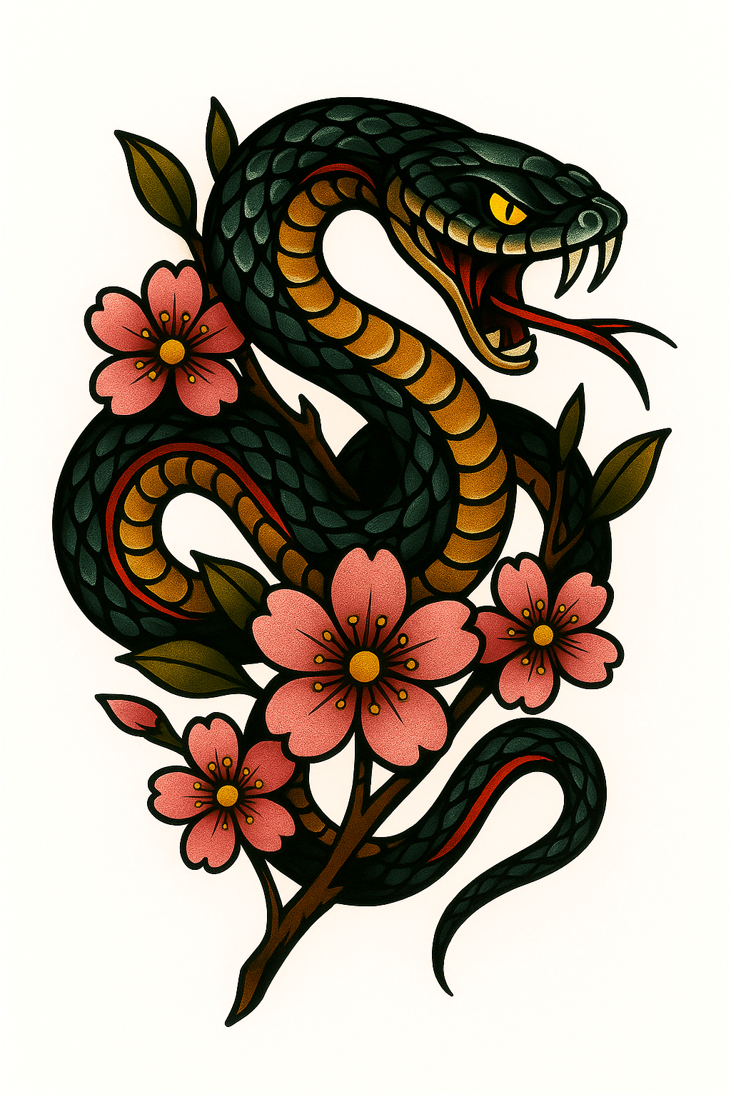 Illustrative Tattoo Design Featuring Serpent and Floral Elements