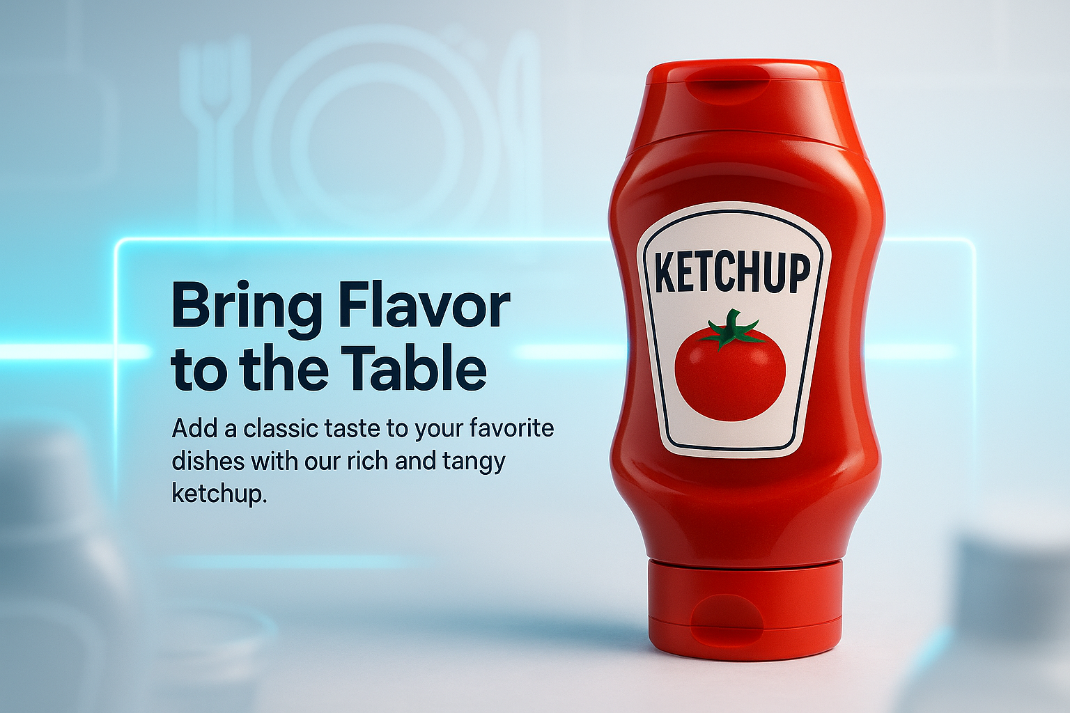 3D product mockup showcasing a ketchup bottle with a vibrant design. Ideal for food branding, advertising, and culinary promotions.