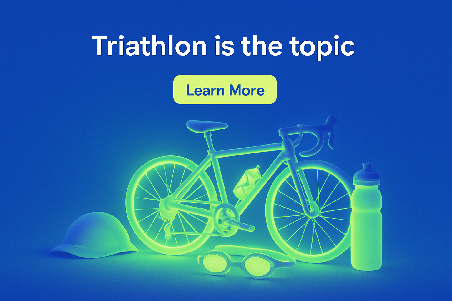 The image features a glowing bicycle alongside essential triathlon gear, including a helmet and water bottle. The glowing elements create an energetic atmosphere against a solid blue background.
