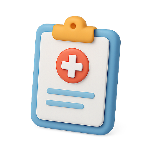 A 3D representation of a medical clipboard featuring a red cross symbol. The design is modern and colorful, suitable for healthcare-related applications and digital interfaces.
