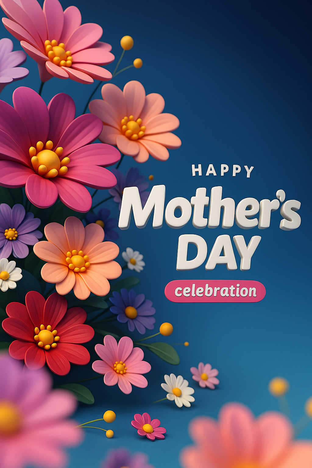 /Collection: /by davooda/Type: PNG/A vibrant 3D illustration for a Mother's Day greeting card featuring colorful blossoms. The design includes a smooth gradient background and layered composition for depth.