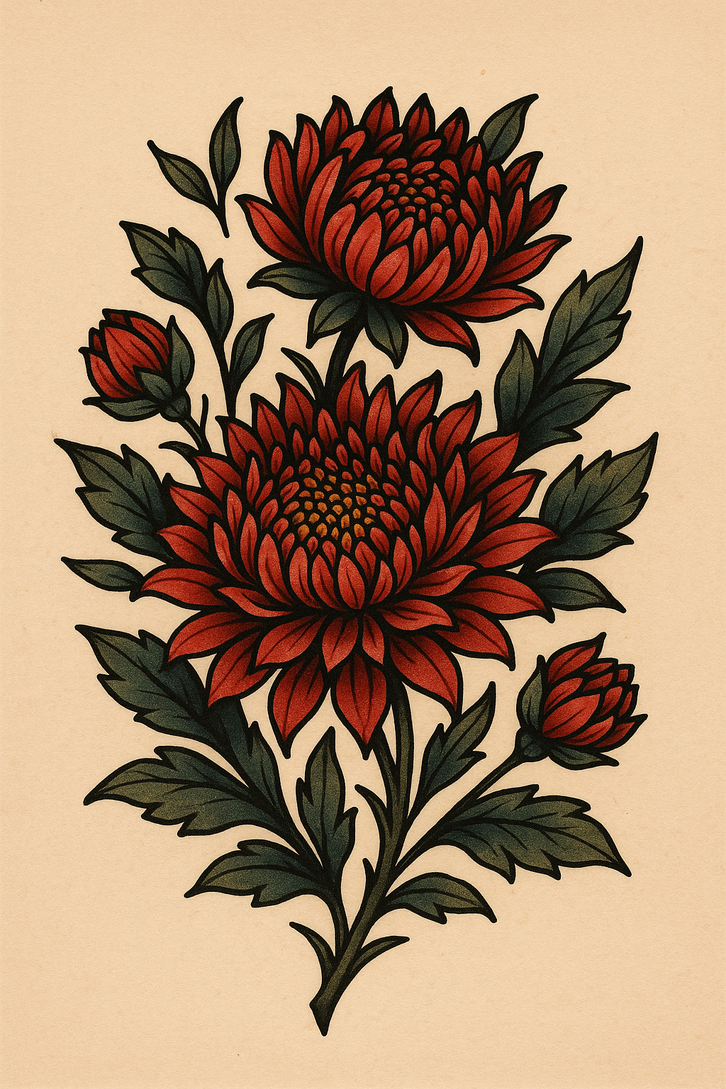 This is a detailed floral illustration featuring red chrysanthemums with green leaves. The design is suitable for art prints or decorative purposes.