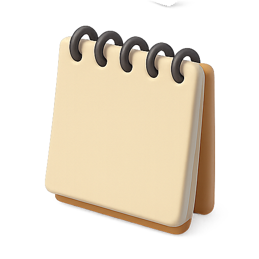 Stylized 3D icon of a spiral-bound notebook, featuring a blank cover. Ideal for use in digital applications to represent notes, planning, or organization.