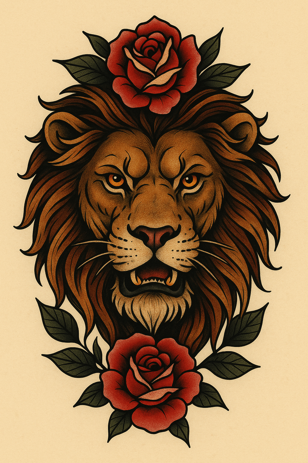 This image features a striking lion's head surrounded by roses, designed in a vintage tattoo style. It's ideal for art prints or tattoo inspiration.
