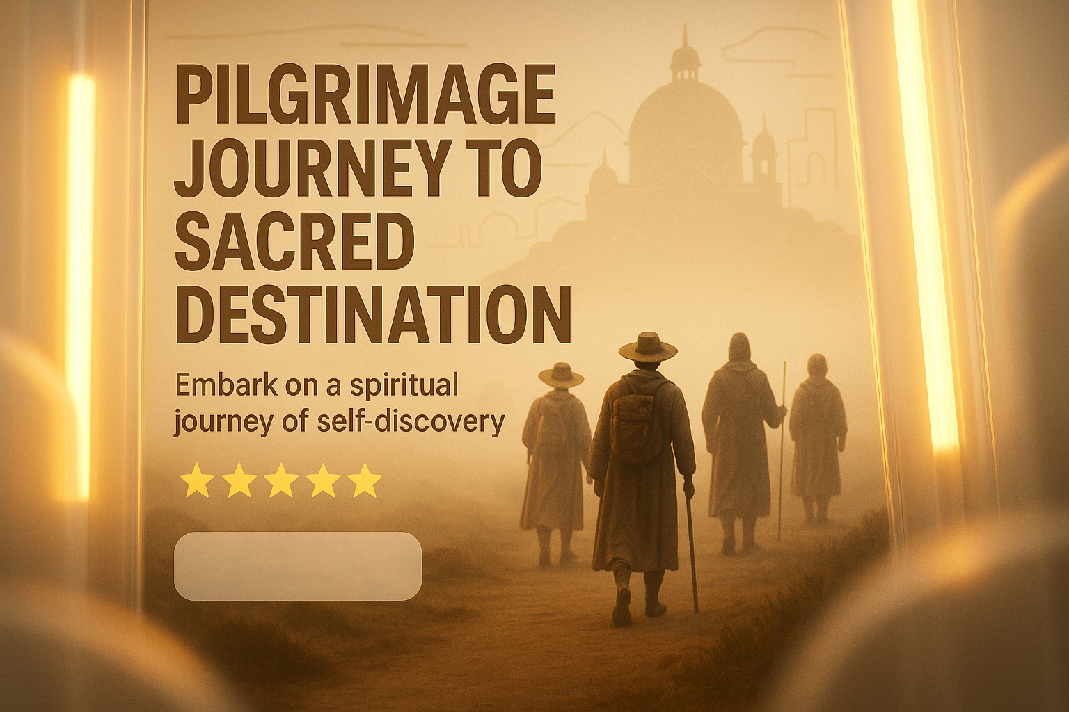 /Collection: /by davooda/Type: PNG/Promotional graphic depicting a pilgrimage journey with a serene landscape, ideal for travel or spiritual retreats. Features a mystical atmosphere and engaging visual elements.