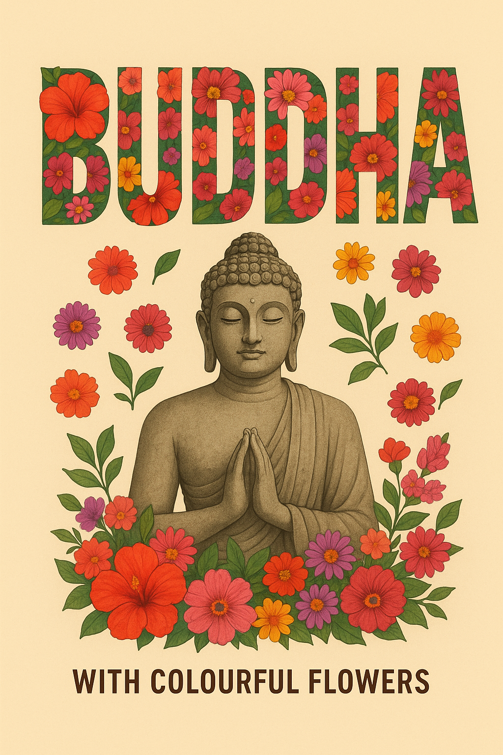 Buddha Statue Illustration Surrounded by Vibrant Flowers