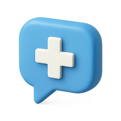 Stylized 3D icon depicting a speech bubble with a white plus sign, suitable for messaging or health-related applications, featuring a modern and clean design.