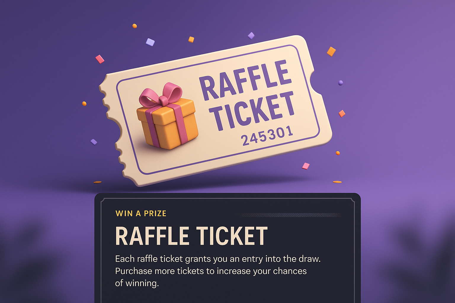 /Collection: /by davooda/Type: PNG/A visually appealing 3D illustration of a raffle ticket featuring a gift box. The design includes a gradient background, a dark panel with prize information, and decorative confetti.