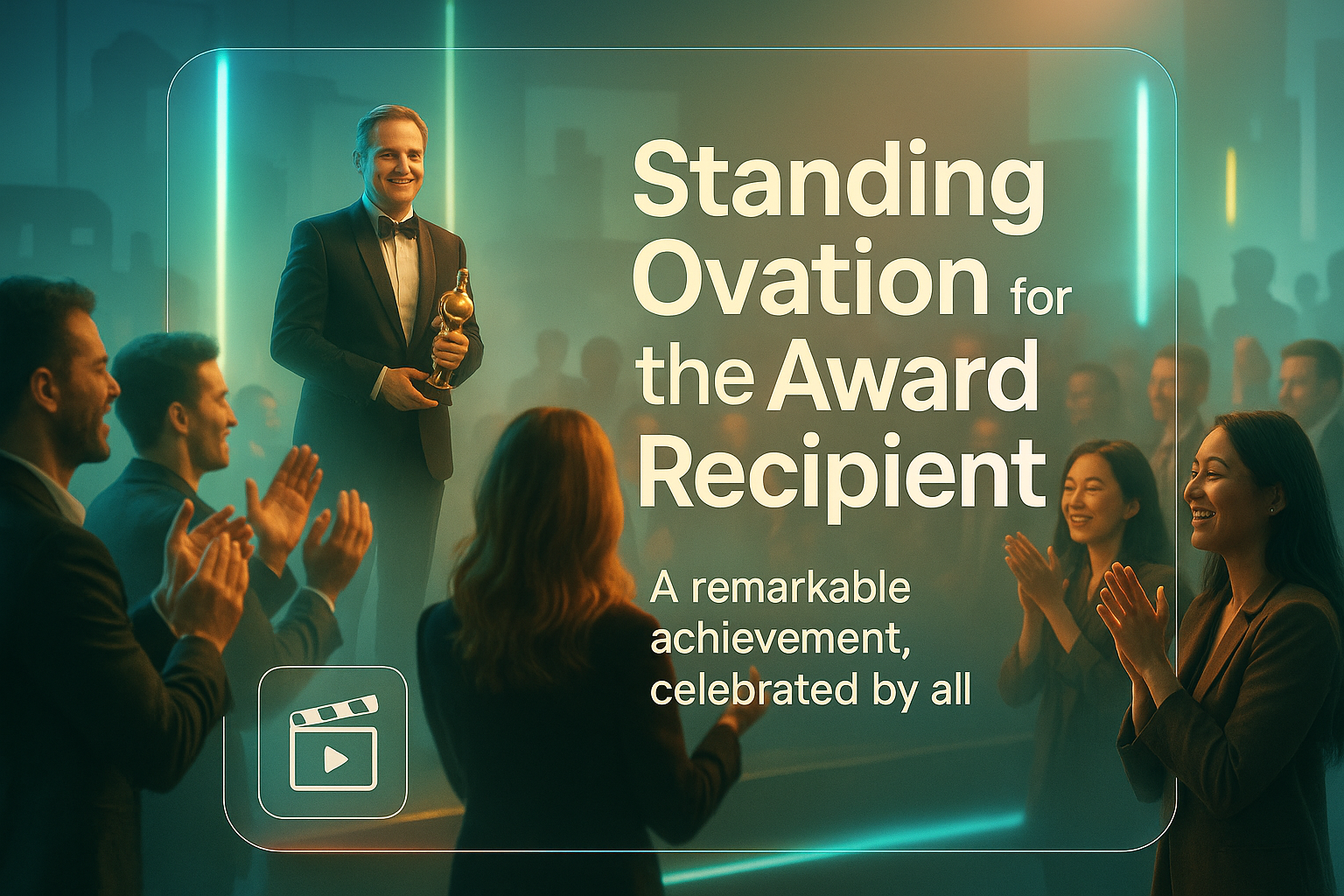 Dynamic image depicting an award recipient receiving a standing ovation, showcasing a celebratory atmosphere. Ideal for events or recognition-themed content.