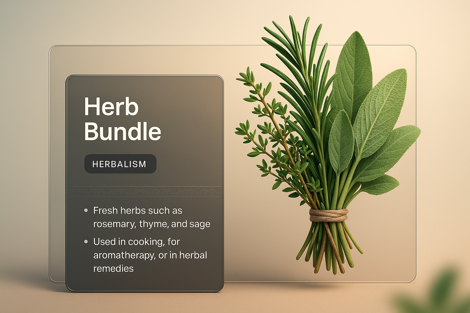 /Collection: /by davooda/Type: PNG/A visually striking 3D illustration featuring a bundle of fresh herbs, complemented by a sleek overlay that provides information on their uses in cooking and aromatherapy.