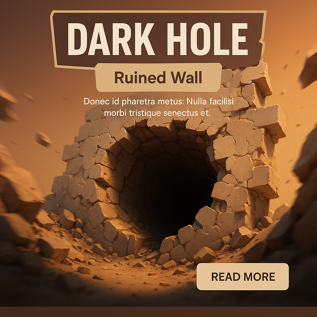 3D graphic depicting a dark hole surrounded by a ruined wall, ideal for digital storytelling or gaming themes. The design features a warm color palette and textured stone elements.