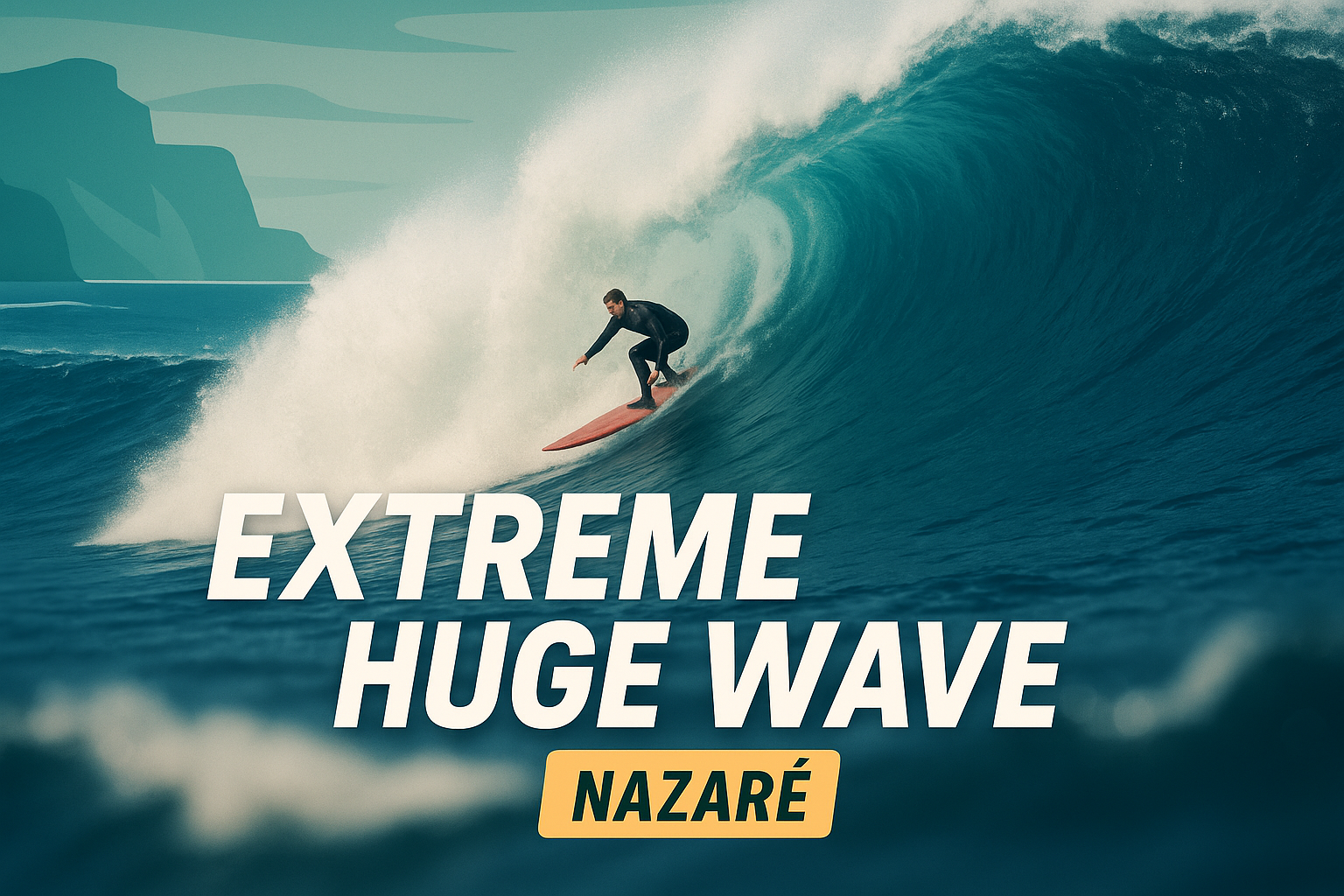 Vibrant graphic depicting a surfer riding a massive wave at Nazaré, showcasing the thrill of extreme sports. Ideal for adventure and sports marketing.