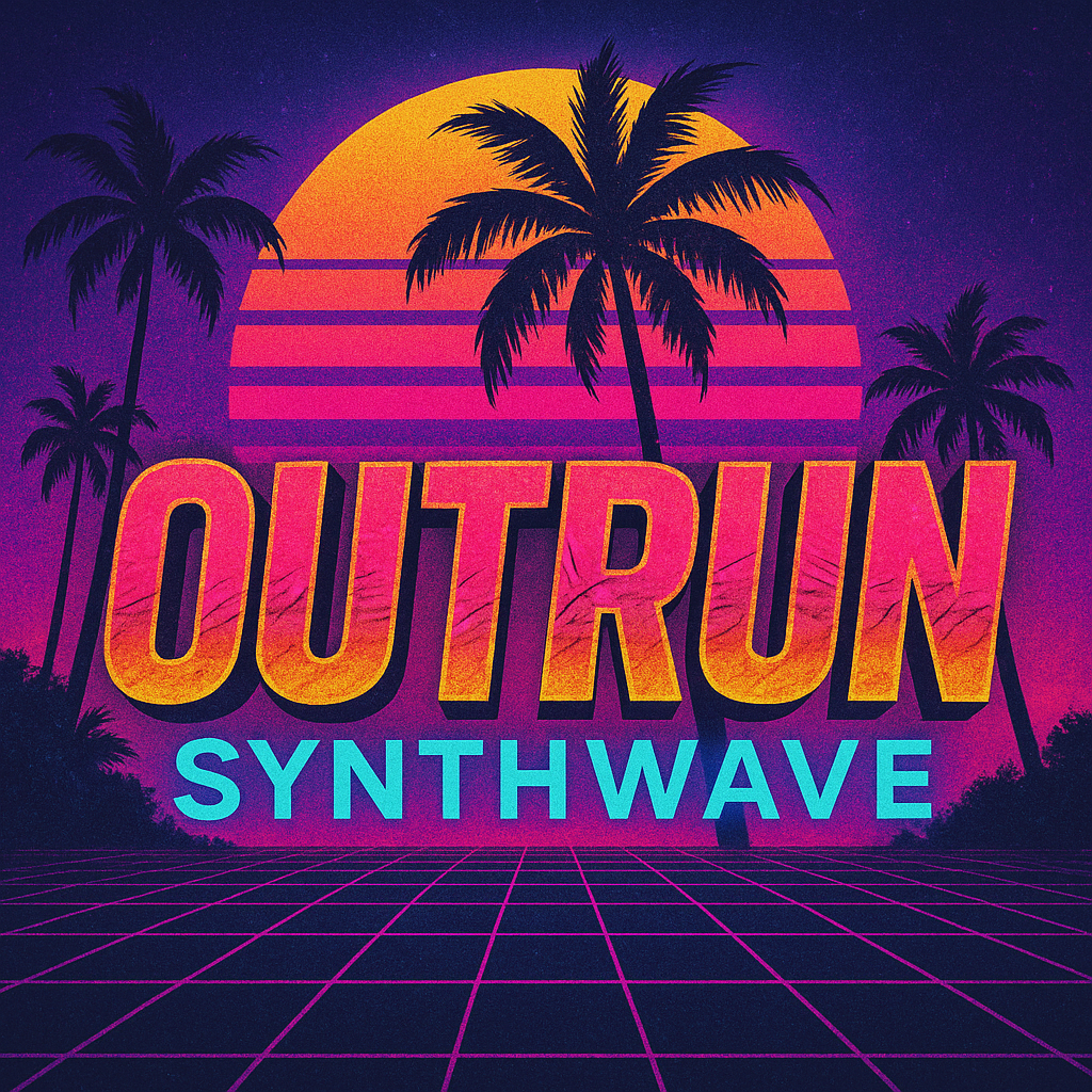 A visually striking synthwave graphic featuring bold typography, vibrant colors, and a retro sunset scene, perfect for music promotions or retro-themed events.
