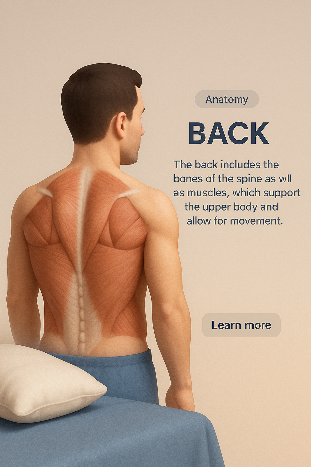 A realistic 3D illustration depicting the human back, showcasing muscles and spine structure. The design features informative text and a call-to-action, all in a zoomed-out perspective.