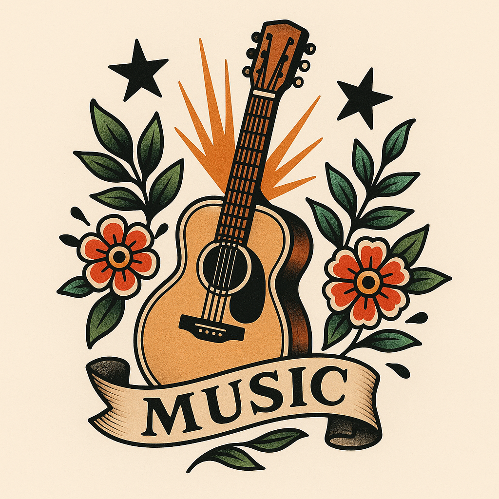 Vintage Music-Themed Illustration with Guitar and Floral Elements