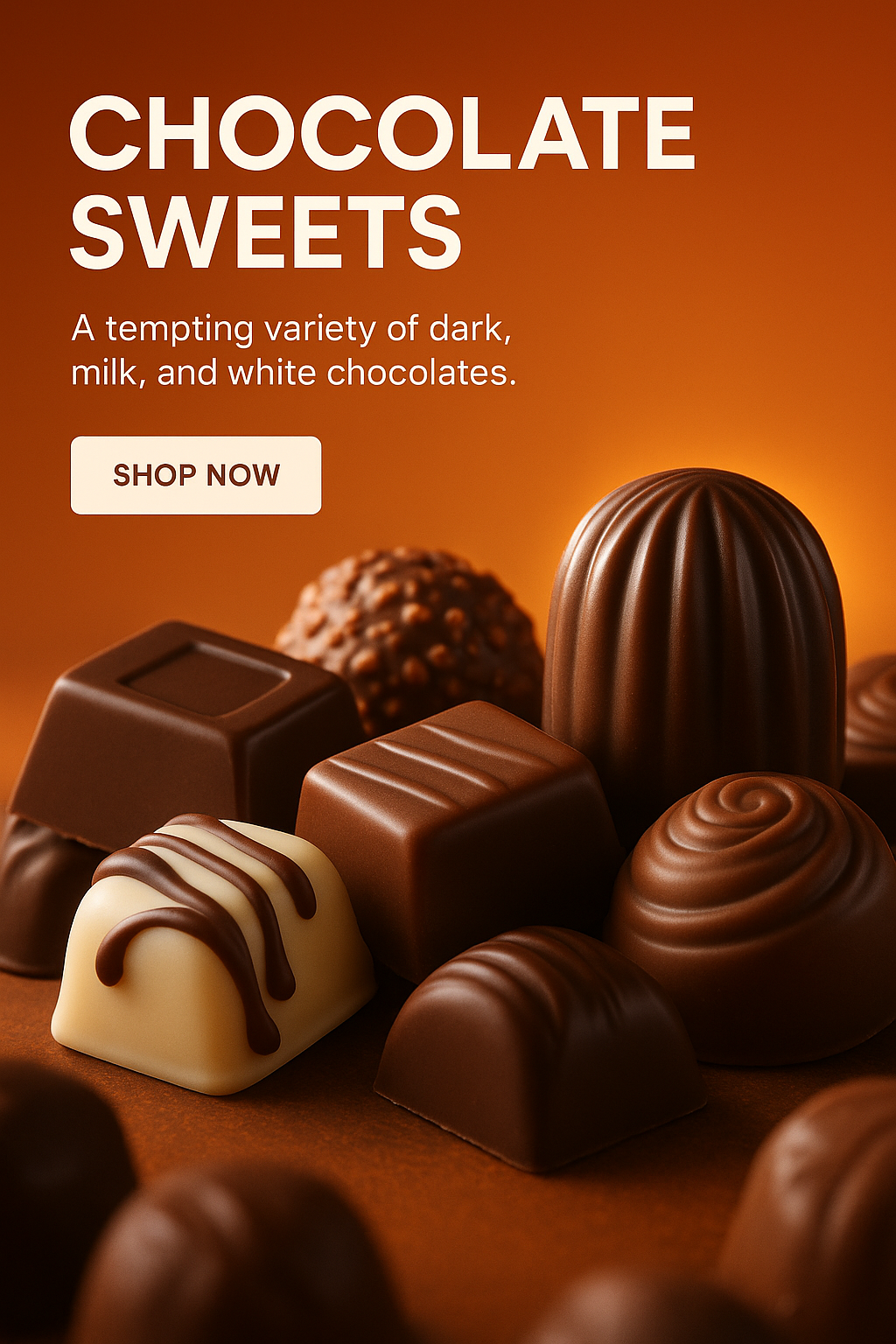 This is a promotional social media post featuring an assortment of dark, milk, and white chocolates against a warm background. It targets chocolate lovers and aims to entice purchases.