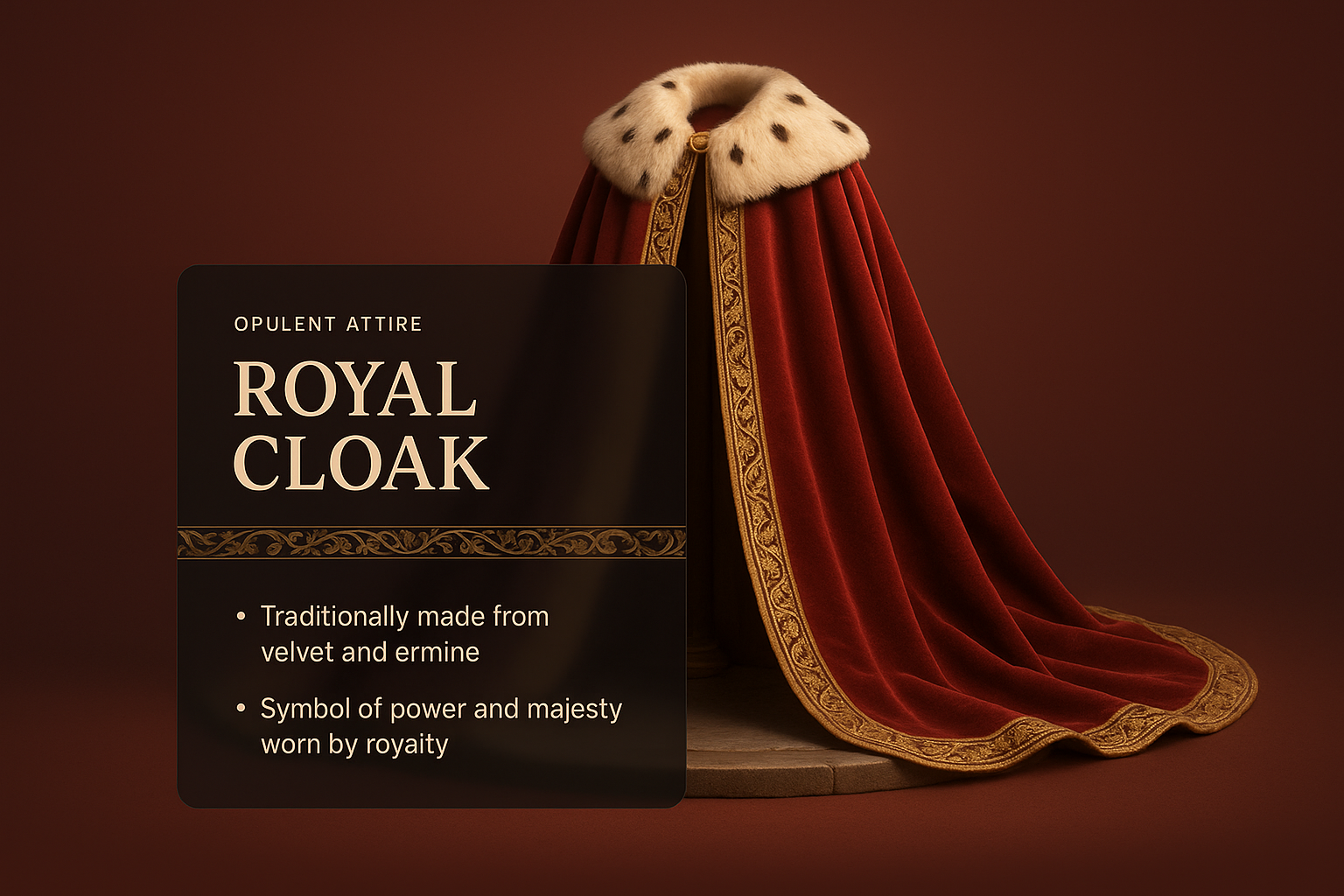 /Collection: /by davooda/Type: PNG/A beautifully crafted royal cloak made of rich velvet and ermine, set against a warm gradient background. Accompanied by a stylish label detailing its significance.