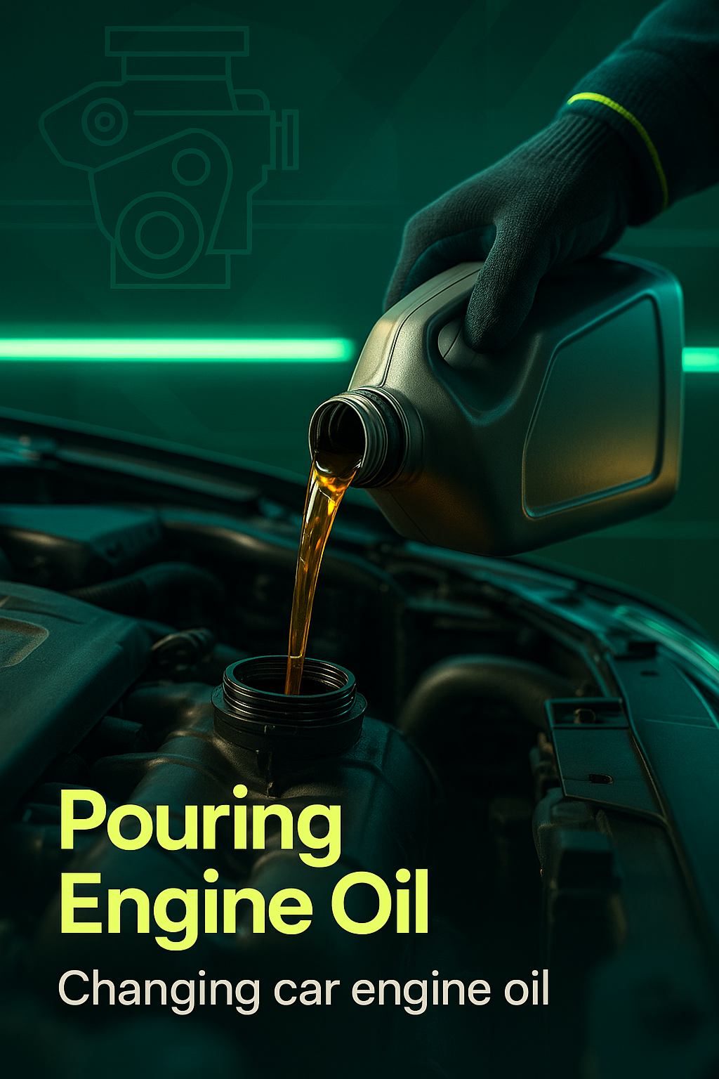 /Collection: /by davooda/Type: PNG/A detailed image capturing the process of pouring engine oil into a car's engine, featuring a dark and modern aesthetic with vibrant green accents, ideal for automotive repair guides.