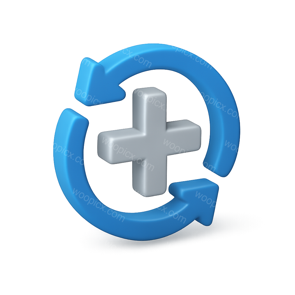 A visually appealing 3D icon featuring two arrows forming a circular shape around a central cross symbol. The design has a transparent background and a three-quarter isometric view, enhancing its volumetric feel.