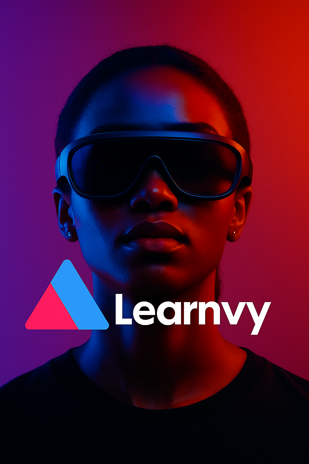 A striking portrait featuring a person wearing oversized sunglasses, set against a backdrop of vivid red and blue lighting. The 'Learnvy' logo is prominently displayed.