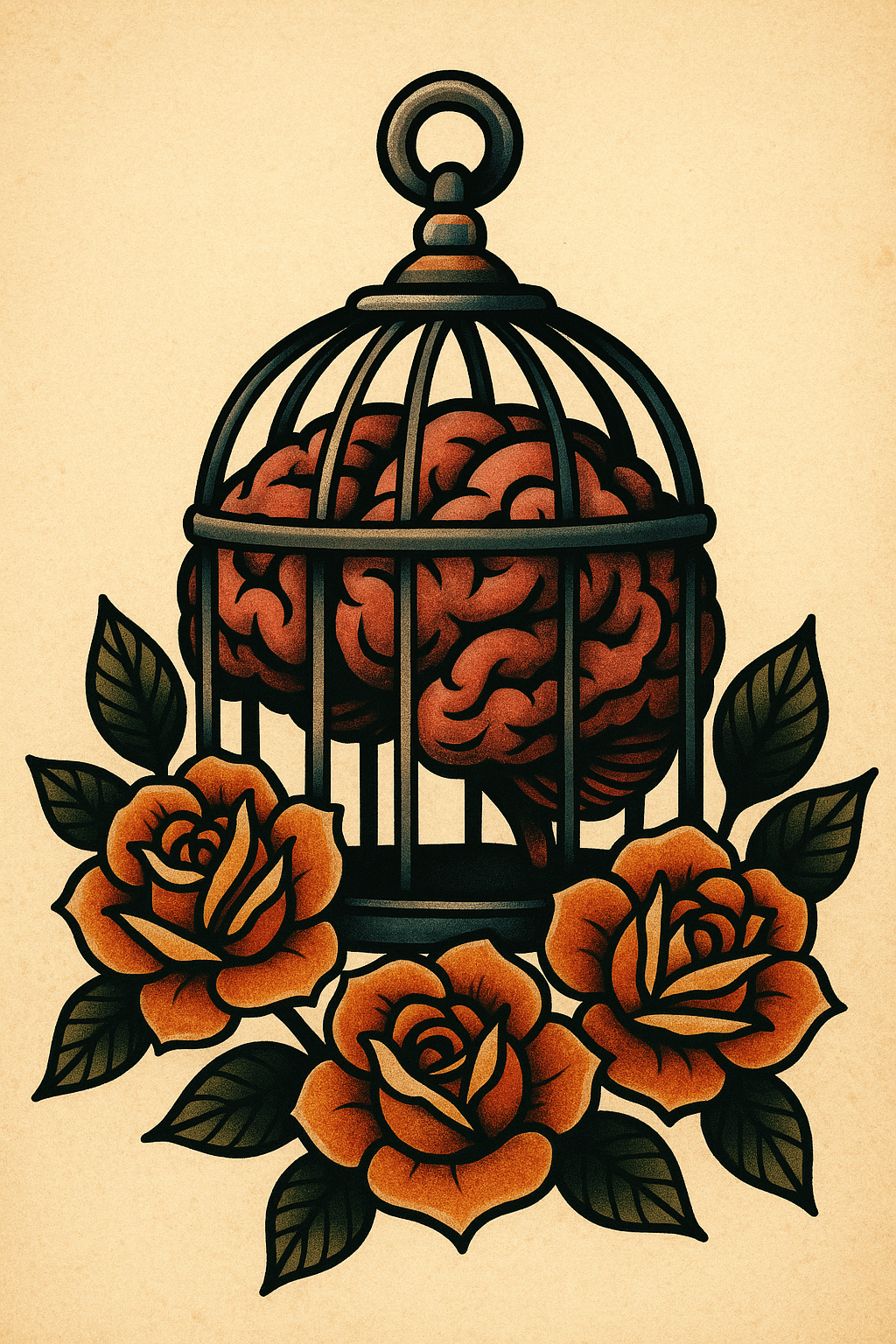 /Collection: /by davooda/Type: PNG/This tattoo design features a brain enclosed in a decorative cage, surrounded by vibrant roses, symbolizing limited beliefs and trapped thoughts. The artwork is colorful against a light beige background.