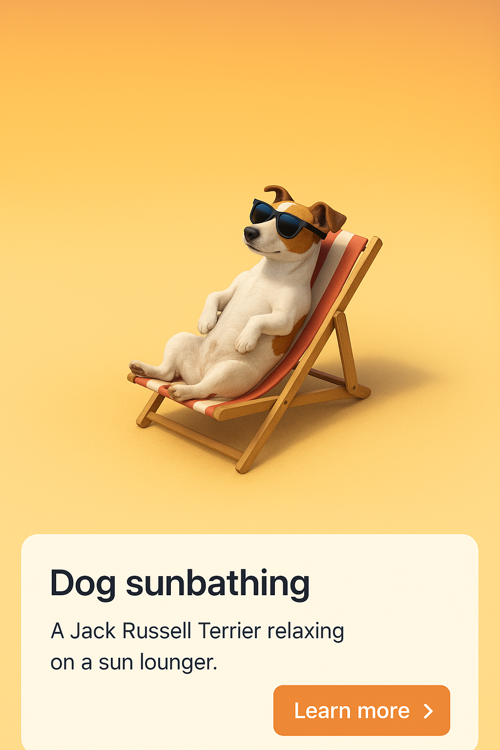 A Jack Russell Terrier in stylish sunglasses enjoys sunbathing on a sun lounger, set against a smooth gradient background. The scene captures a relaxed summer vibe, showcasing a playful pet enjoying leisure time.