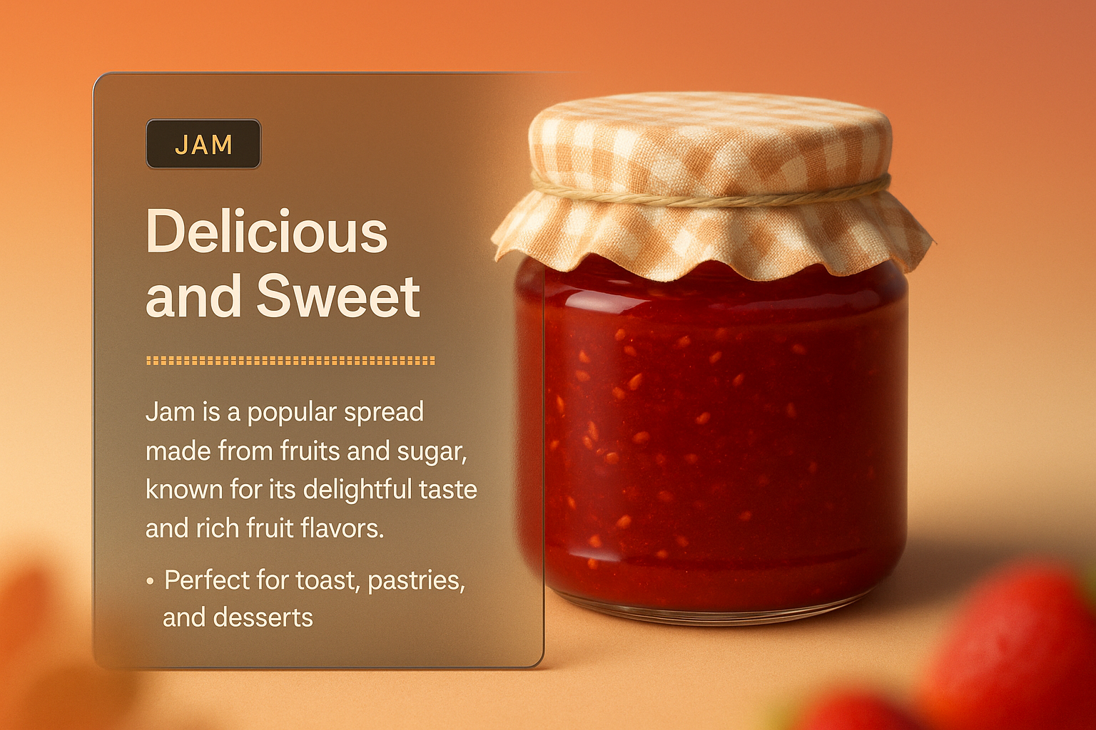 A beautifully designed 3D illustration featuring a jar of jam, highlighting its delicious and sweet qualities. The jar is adorned with a checkered lid and accompanied by informative text blocks.