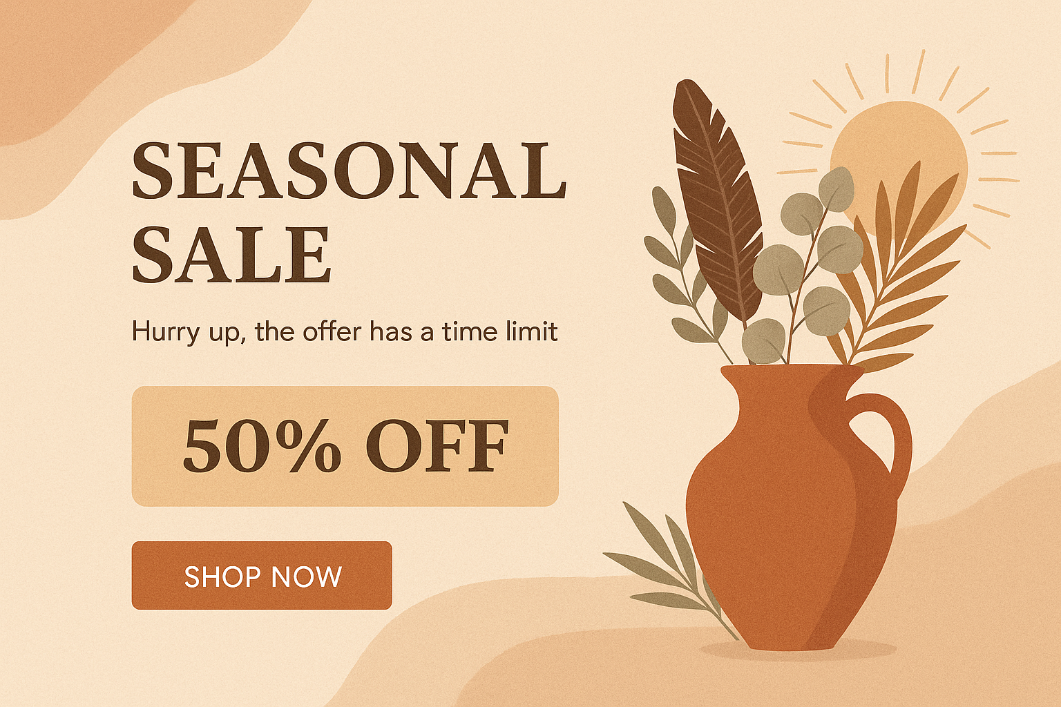 /Collection: /by davooda/Type: PNG/A visually appealing poster promoting a seasonal sale with a boho aesthetic. Features a decorative vase with foliage, sun graphics, and clear discount information.