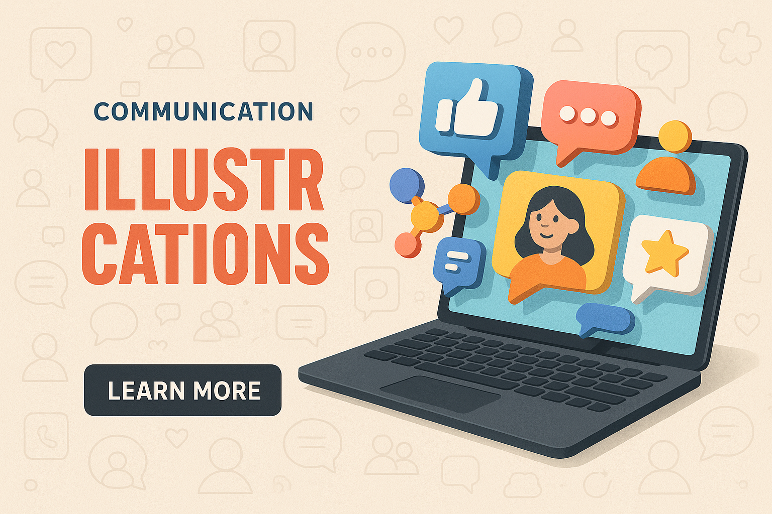 /Collection: /by davooda/Type: PNG/A visually striking illustration depicting digital communication through a laptop screen, featuring playful icons and bold typography. The design balances colors and shapes for modern appeal.