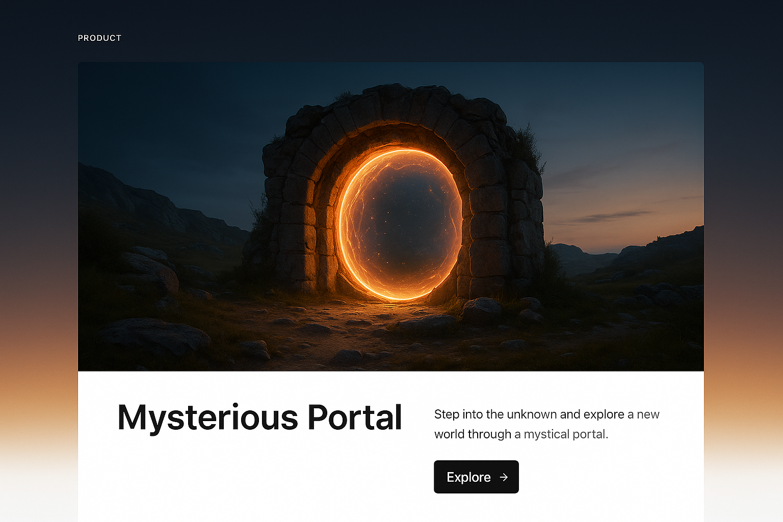 A stylish web page design featuring a mystical portal. The background is a dark gradient with a vibrant portal illustration, accompanied by a clear title and action button.