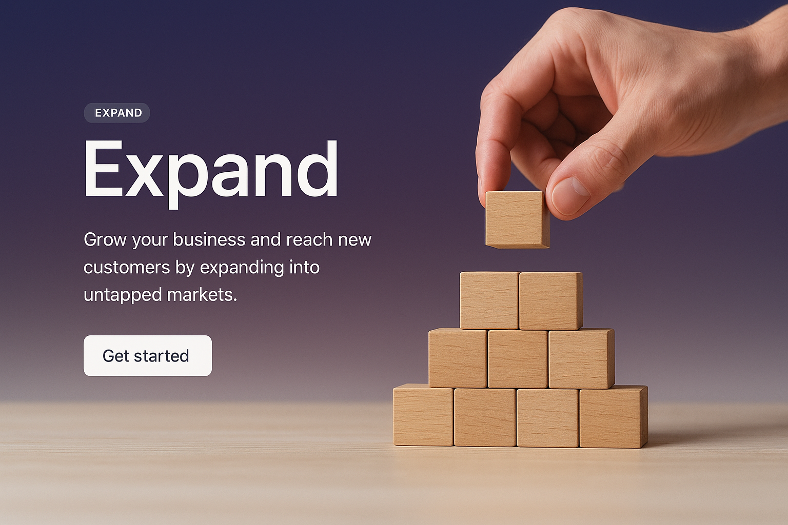 A modern web design showcasing a hand stacking wooden blocks with the word 'Expand'. Features a gradient background and a clear call-to-action button.