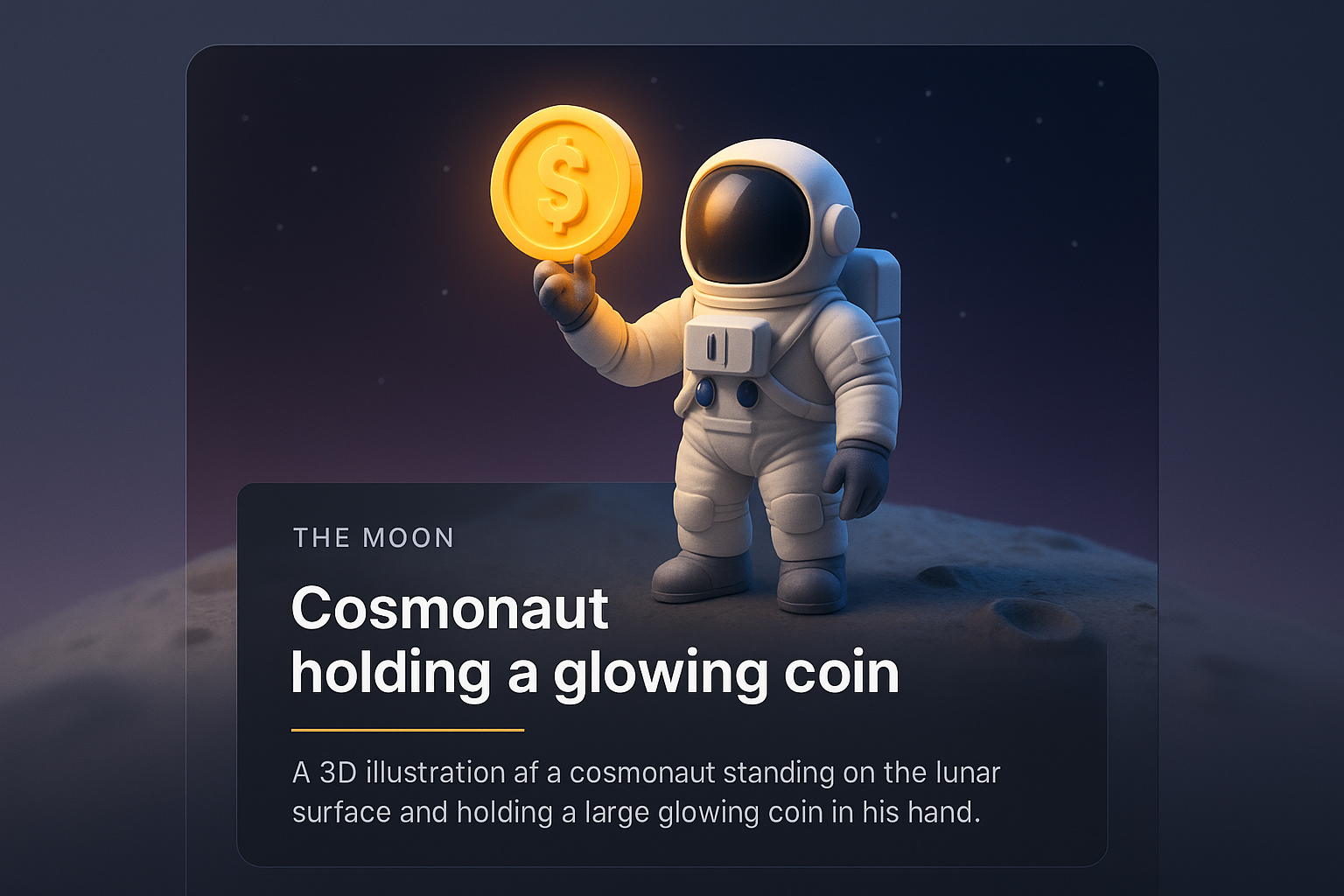 /Collection: /by davooda/Type: PNG/A detailed 3D illustration of a cosmonaut on the lunar surface, holding a glowing coin. The background features a smooth gradient, enhancing the space theme.