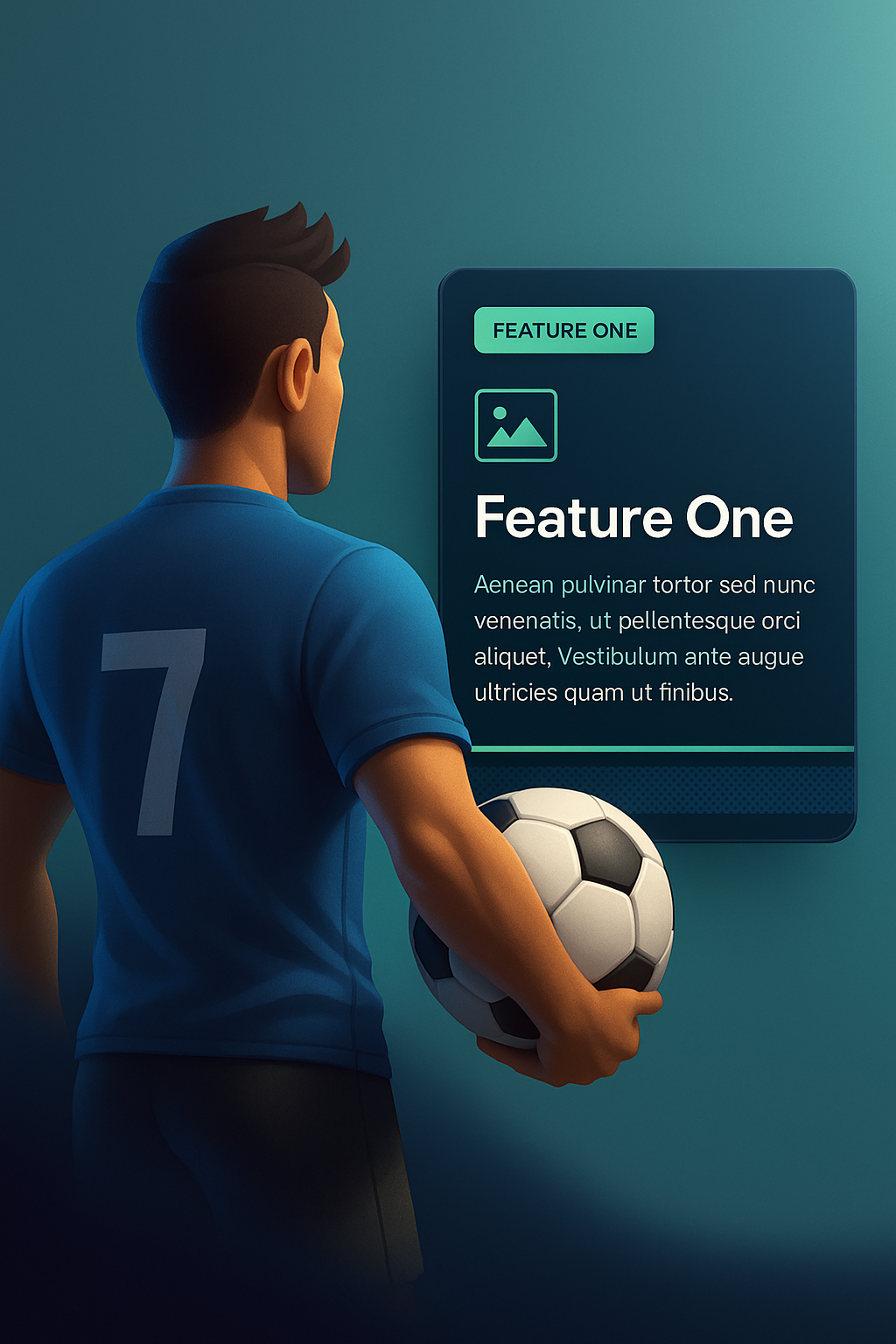 /Collection: /by davooda/Type: PNG/A 3D illustration depicting a soccer player in motion, holding a soccer ball. A feature block with a title and description is creatively integrated into the scene.