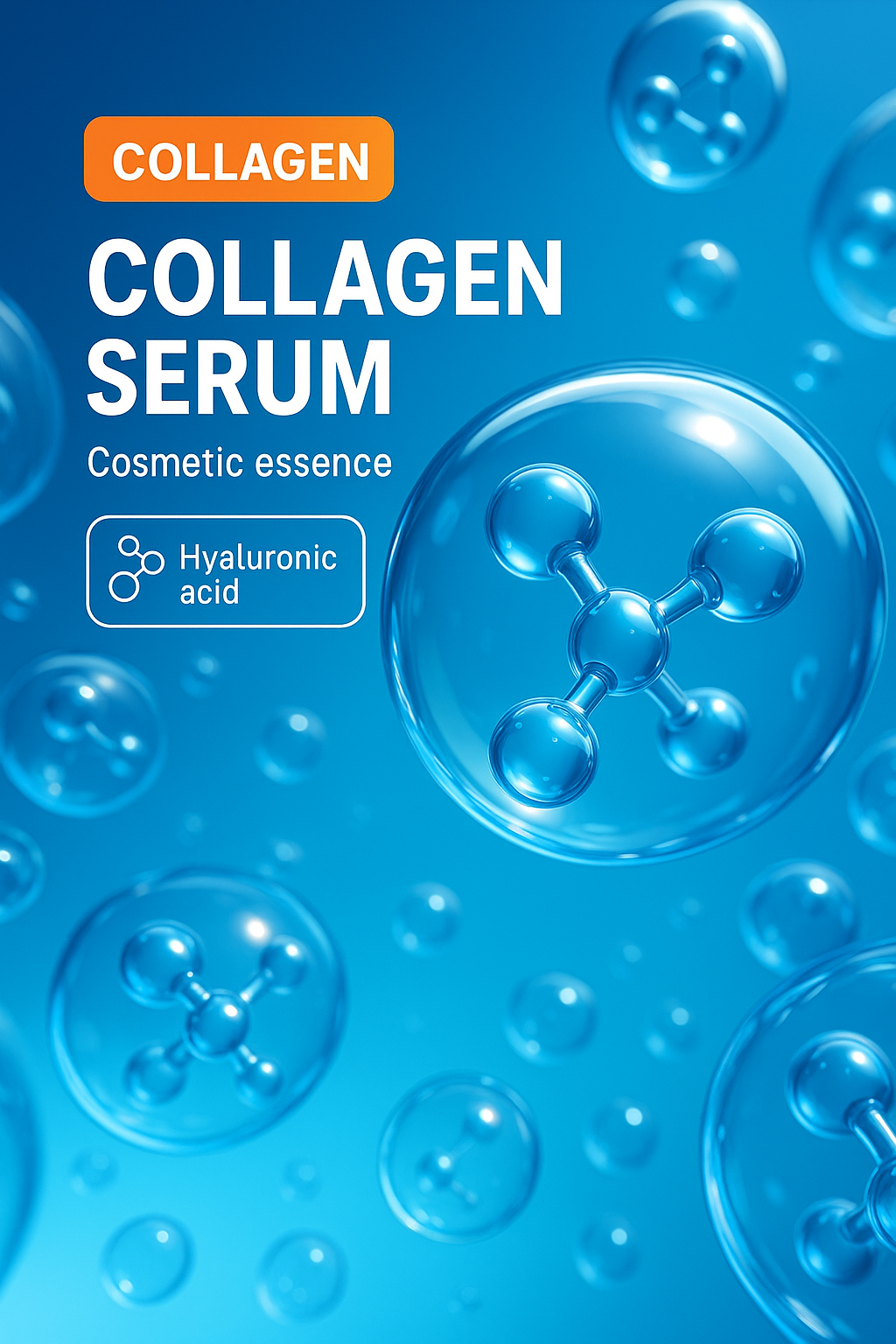 /Collection: /by davooda/Type: PNG/This image features a visually appealing graphic of collagen molecules and bubbles, designed for cosmetic product marketing. It uses a vibrant blue background to attract attention.