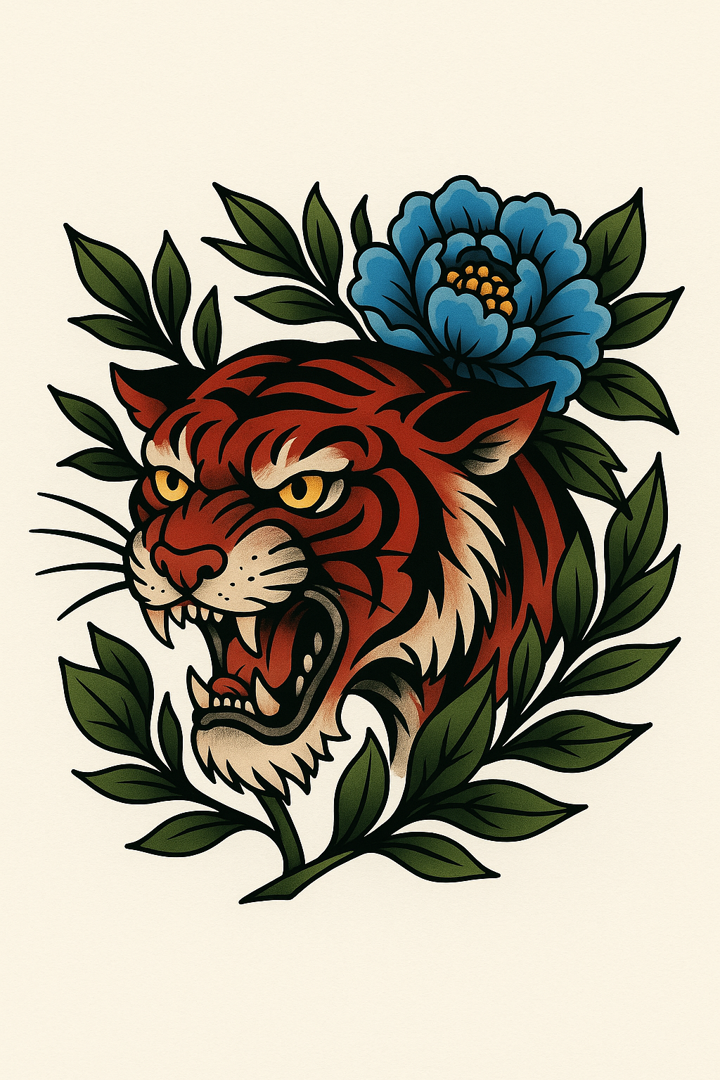 Bold Traditional Tiger Tattoo Design with Floral Elements